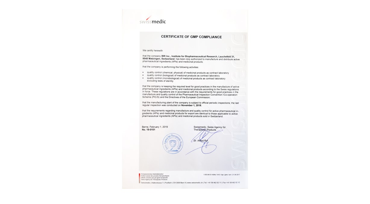Beside the longstanding GLP compliance for analytical, clinical chemistry, pharmacokinetics, immunological, efficacy and potency testing, the GMP certification is an essential part of the Quality System of IBR Inc.